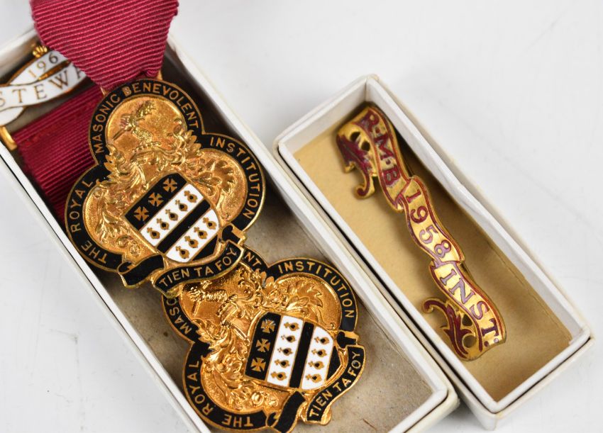 Collection of silver gilt and enamelled Masonic jewels and medals to include Hospital jewel Aegros Sanat Humanitas hallmarked and engraved on reverse, together with several smaller Hospital medals (charity jewels), RMBI 1961 Steward's jewel, Annual RMBI festival 1955, Institutes for both Girls and Boys jewels and 1958 RMBI bar (15)