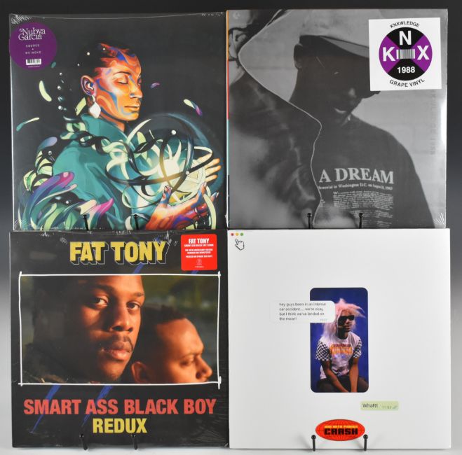 Twenty six Hip Hop / Trip Hop / Techno / House / R&B / Soul etc LPs, most in open shrink wrap. Thrust, Eluvium coloured vinyl, LNS and DJ Sotofett, Pop Ambient 2021, Blackalicious coloured vinyl, Yo! Boombox, Alfa Mist, The Slow Readers Club, Leon Bridges with alternative cover design, Tangent splattered vinyl, Fat Tony red viny), Max I Million coloured swirl vinyl, Doctor Bionic, Knxwledge grape coloured vinyl, Bad With Phones, Nubya Garcia, Skeleten, Usher clear vinyl, Al Lover, Fat Freddy's Drop, Wolf Eyes, Arles, J Rocc, James Hunter Six, Ismael Ensemble, Whitney Houston. Twenty four are sealed in shrink wrap, the others appear Ex+.