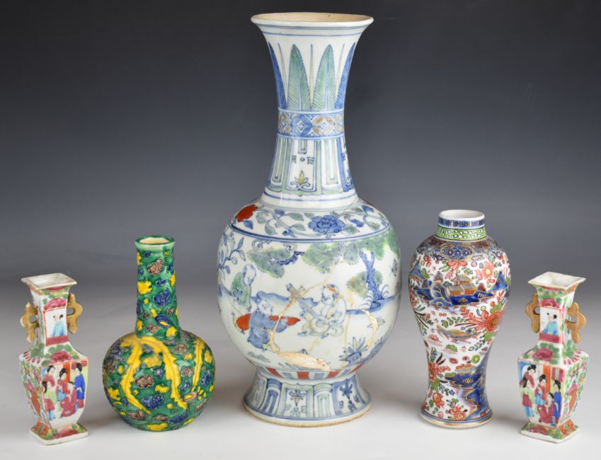 Five Chinese and Japanese vases including including clobbered vase with blue and yellow decoration on green ground and three character signature to base, a pair of famille rose twin handled vases and a Wucai vase with figural decoration and six character mark to base, 36cm tall.