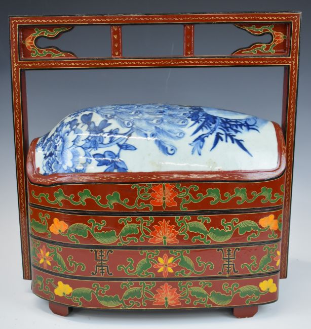 Chinese lacquer four division dowry, wedding or nesting box with floral decoration and likely porcelain cover, W46 x D27 x H47cm