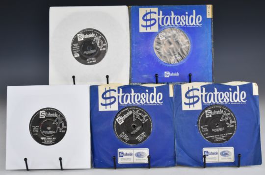 Collection of approximately fifty seven UK Stateside 7" singles. Around half in Stateside company sleeves. Soul / Rock / Pop / Beat, artists include Bob Crew, Del Shannon, Supremes, Wayne Thomas, Lee Dorsey, Four Seasons, Gary US Bonds, Miracles, Shirelles, Gene Pitney, Chiffons, Marvin Gaye, Isley Brothers, Big Dee Irwin, The Toys, Jimmy Soul, The Rockin' Rebels, Ray Charles, Freddy Cannon, Mary Wells, Stevie Wonder, Crow, Norma Tanega, Mary Wells and Marvin Gaye, Dion, Jimmy Reed, Chiffons, Mitch Ryder, Jimmy Witherspoon, The Hearts, The Tams and John Lee Hooker. Vinyl appears to be VG+ or better in the main
