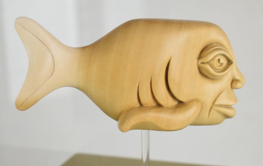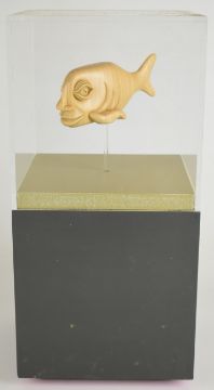 Gareth Lye (Welsh, born 1972), FI'SHAMAN, carved limewood study of an anthropomorphic fish, in Perspex display case and supported on a rod, overall height including base 41.5cm