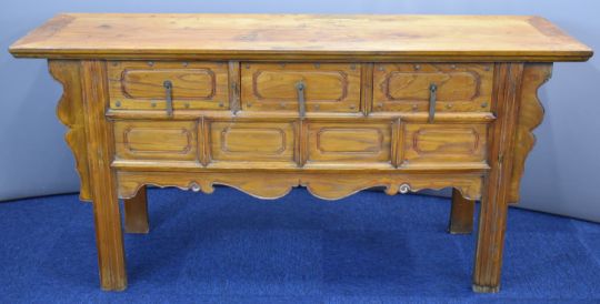 19th/20thC Chinese elm jointed kang or console table with three drawers, moulded supports and shaped apron, raised on reeded legs, W153 x D55 x H84cm