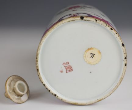 18th/19thC Chinese porcelain comprising famille verte vase, tea bowl, famille rose covered bottle and a stapled shallow dish with figural decoration, tallest 19.5cm
