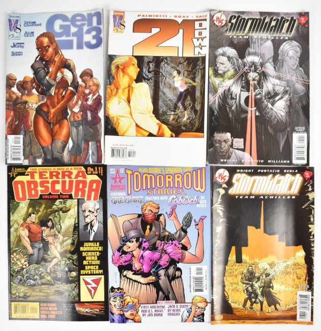 Approximately two hundred and fifty indie comics by Wildstorm, Top Cow, Cliffhanger, America's Best and similar to include Gen 13, Promethea, The Authority, Witchblade, Tom Strong, Planetary and Astro City, with works by Alan Moore, Mark Millar, Neil Gaiman, Garth Ennis and others.