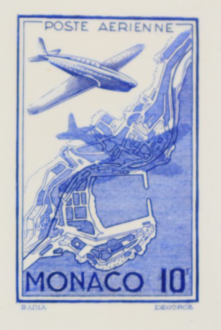 Collection of proof essays of Monaco Air Mail stamps, proof essay of 1942 and 1947 Air Mail issues and a sheet of 1947 Philatelic Exhibition Setennant strips