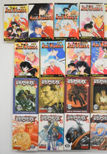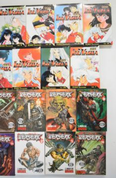 Forty one Japanese Manga graphic novel comics comprising twenty volumes of Beserk by Kentaro Miura and twenty one Inu Yasha by Rumiko Takahashi, published by Dark Horse and Action/Viz Media.