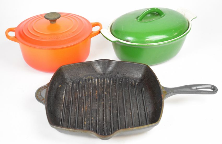 Le Creuset twin handled covered casserole pans no 20 and no 26 griddle pan and an unmarked green lidded casserole, probably Aga