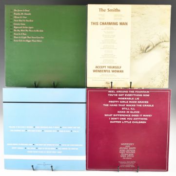 Smiths collection of three LPs and four 12" singles. LPs are self titled (Rough 61) with maroon on grey inner lyric sheet, Hatful of Hollow (Rough 76) with blue die cut inner lyric sheet and The Queen Is Dead (Rough 96) with inner liner picture sleeve with credits. 12" singles are This Charming Man (RTT 136), What Difference Does It Make (RTT 146), Bigmouth Strikes Again (RTT 192) and I Started Something I Couldn't Finish (RTT 198). This Charming Man vinyl appears G+ range. the remainder appear VG+ to Ex in the main