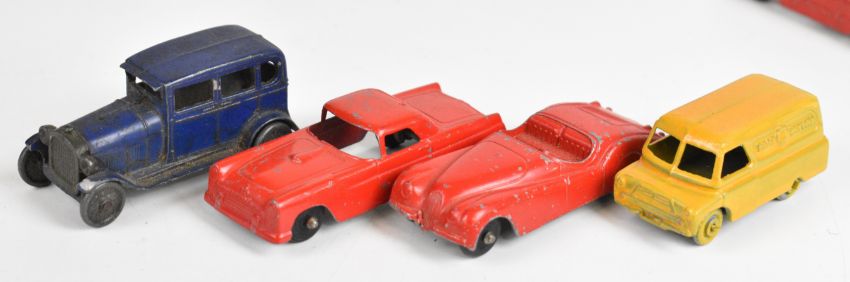 Twenty vintage diecast model cars by Tootsie Toys, Toby Toy and Charbens to include Ford Thunderbird, Torpedo Sedan, Jaguar XK Cabriolet and Fire Truck.