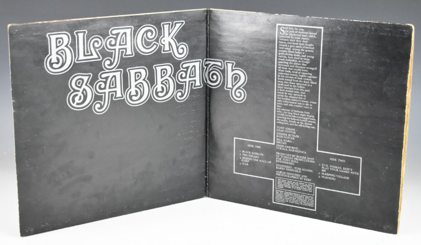 Black Sabbath (V06 847 903 VTY) debut self titled LP UK first pressing with Vertigo 'swirl' label with correct 'swirl' inner sleeve with 'suffocation' warning. Matrix / runout side A is stamped, V0 6 1Y * 1 420 12 12 and matrix / runout side  B is stamped V0 6 2Y * 1 420 12 4. On the inside of the gatefold sleeve the incorrect copyright statement “Copyright subsists in all Stereo recordings…” is present. This was corrected to “Copyright subsists in all Vertigo recordings…” on later 'swirl' pressings. The labels are clean and the B side has a big swirl logo above the spindle hole, the wording ''Vertigo'' below the spindle hole and 'A PHILIPS RECORD PRODUCT' as lower perimeter text. The visual grading is generally VG / G+ but there is a 5-7mm mark on the side B run in, most of which is in the deadwax. It was play tested on a Technics record deck and the mark caused several ticks at the start of track 1 side B and no skips on the Technics deck. The cover has age related wear.