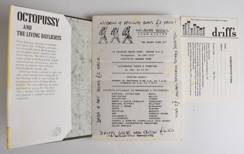 Ian Fleming Octopussy And The Living Daylights, published Jonathan Cape 1966 first edition in hardback with gilt lettering and marbled endpapers, in original colour dust-wrapper designed by Richard Chopping with the 16s 80p price sticker on inside flap and a loosely inserted flyer from Holborn Books presenting the copy as a free gift, stating that the price of future copies ordered would be £2 post free