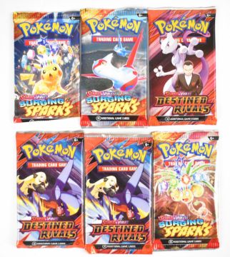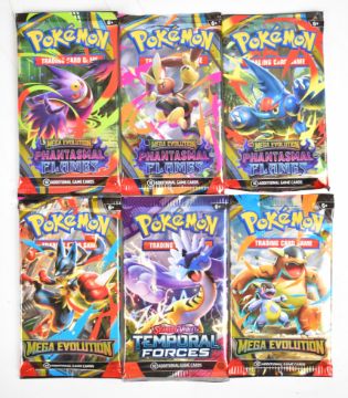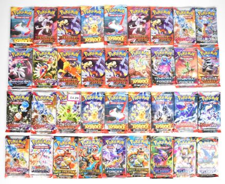Pokémon TCG - Thirty six sealed booster packs from Scarlet & Violet and Mega Evolution series to include Surging Sparks, Temporal Forces, Stellar Crown, Paldea Evolved, Prismatic Evolutions, Destined Rivals and Phantasmal Flames.