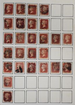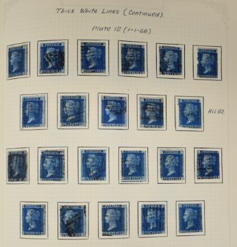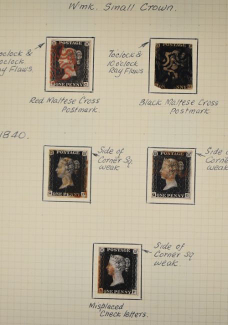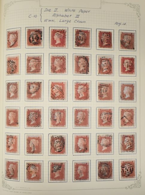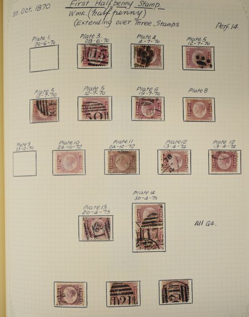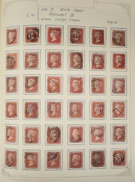 Two volumes of GB Queen Victoria stamps including eleven 1880 1d blacks, varying margins but various flaws described. Good range of 1d reds from imperf to plates, collection with imperfs cancelled with Maltese Crosses including MX with numerals. 1d red plates to 225, many plate numbers duplicated for postmarks. 1870 ½ds plates 2-14 (no plate 9), ranges of 2d blues 1840 to plate numbers. Surface printed stamps and 1887 Jubilee issues.
