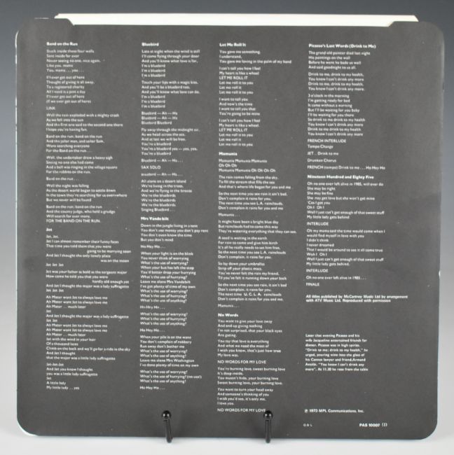 Wings Band On The Run Nimbus Supercut LP (Apple Records PAS 10007). Vinyl, cover, picture inner sleeve and poster all appear to be Ex+. One of six Nimbus Supercut LPs in this auction, all from a single private collection and all with Nimbus hype sticker on the main sleeve and ‘Nimbus England’ stamped in the dead wax. Nimbus Supercut LPs were produced from the original master tapes using an unlimited all valve mastering process, resulting in an extremely high quality pressing. Only around 1000 pressings of each title were made, and were released as a mail order only promotion to magazine readers