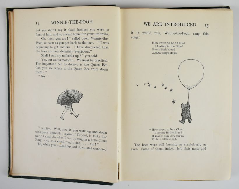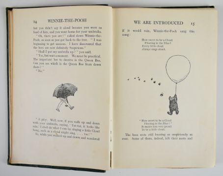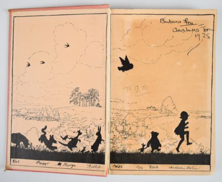 A.A Milne complete set of Winnie-the-Pooh books illustrated by Ernest H. Shepard and published by Methuen & Co. Ltd 1924-1928, comprising When We Were Very Young (1924), Winnie-The-Pooh (1926), Now We Are Six (1927) and The House At Pooh Corner (1928), the last three all first editions while the first title is a second edition published just one month after the first edition, original coloured cloth bindings with gilt decorated covers and lettered spines, illustrated endpapers (4)