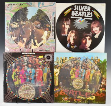 Seven Beatles picture disc LPs comprising Help! (Dutch bootleg), Live on Air 1963 Volume One (limited edition of 2000), Abbey Road, two Sgt Pepper's, Silver Beatles and The Alternative White Album. Vinyl appears to be Ex or better