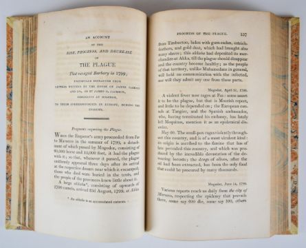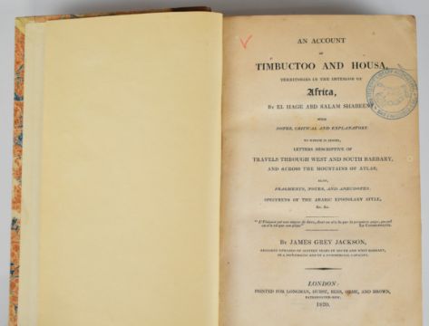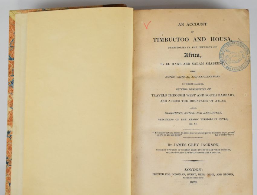 [Travel] An Account of Timbuctoo and Housa Territories In The Interior of Africa by El. Hage Abd Salam Shabeeny, to which is added Letters Descriptive of Travels Through West and South Barbary and Across the Mountains of Atlas by James Grey Jackson, printed for Longman, Hurst, Rees, Orme and Brown 1820 first edition with two engraved folding maps ‘Tracks Across the Sahara to Timbuctoo’ and a map of ‘The Empire of Morocco’ bound in quarter leather with gilt lettered label