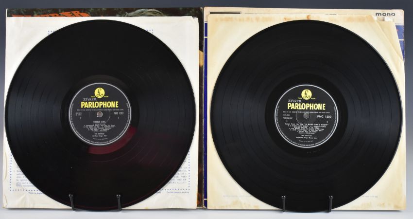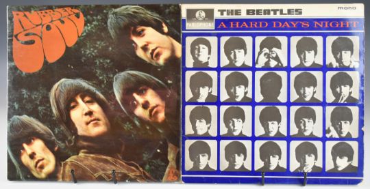 Two Early Beatles LPs. Rubber Soul (PMC 1267) loud cut crossover pressing with the loud cut matrix/runout on side 1, YEX-579-1 but side 2 matrix/runout is YEX-780-4, front laminated triple flip back Garrod and Lofthouse sleeve, labels have 'The Parlophone Co' and Sold in UK Subject to' text. Apparently released in error, this press appears harder to find than the -1 -1 loud cut LP. Second LP is A Hard Day's Night (PMC 1230) with front laminated triple flip back Garrod and Lofthouse sleeve, labels have 'The Parlophone Co' and Sold in UK Subject to' text. Both appear to be VG+ in the main.