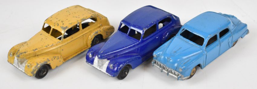 Fourteen Dinky Toys diecast model cars and military vehicles to include Studebaker, Town Sedan, Oldsmobile, Chrysler Royal Sedan, 10 Ton Army Truck, Recovery Tractor and Leopard Tank.
