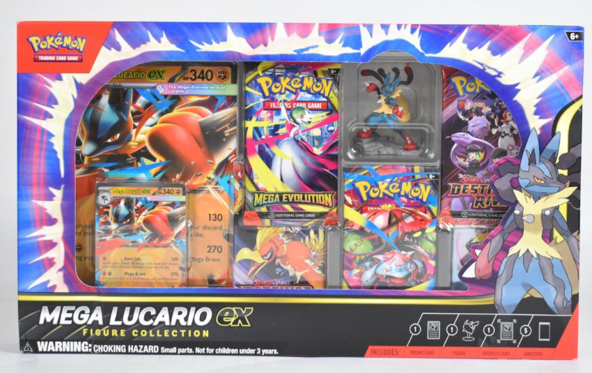 Pokémon TCG - Three Scarlet & Violet / Mega Evolution 'Premium Collection' and 'Figure Collection' boxed sets comprising Mega Lucario ex, Ogerpon ex and Combined Powers, all sealed.