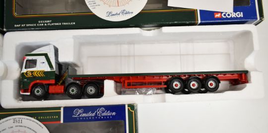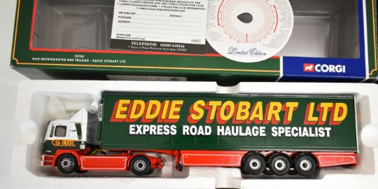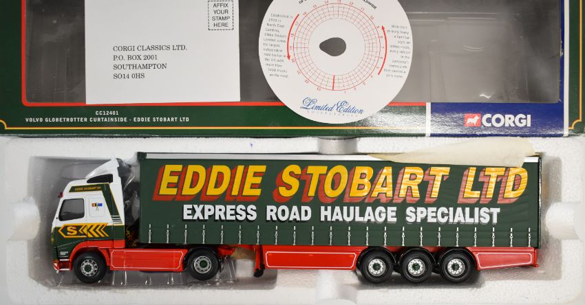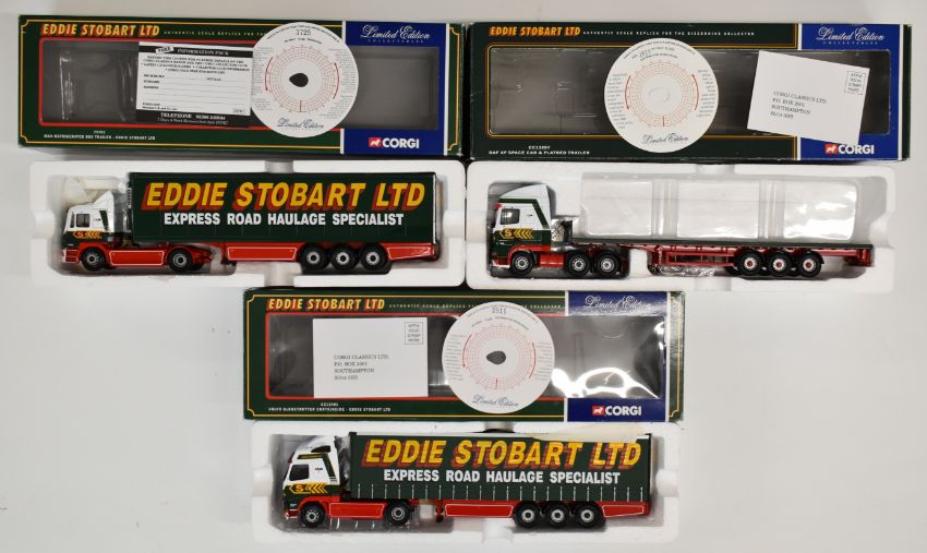 Three Corgi Eddie Stobart 1:50 scale diecast model haulage vehicles comprising MAN Refrigerated Box Trailer 75702, DAF XF Space Cab & Flatbed Trailer CC13207 and Volvo Globetrotter Curtainside CC12401, all boxed with certificates.