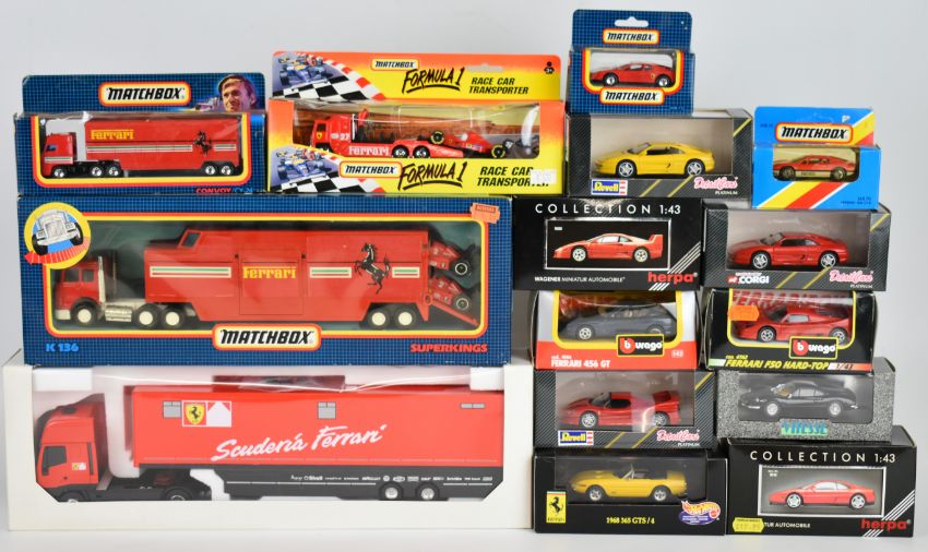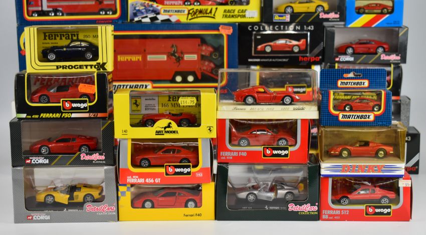 Twenty five 1:43 scale diecast model Ferrari sports cars by Bburago Herpa, Maisto, Vitesse, Matchbox, Corgi and Detail Cars, together with four Ferrari haulage vehicles, all in original boxes.