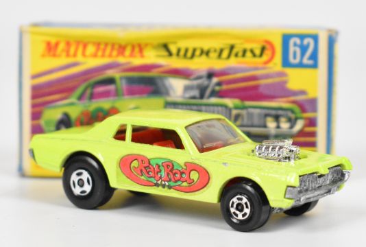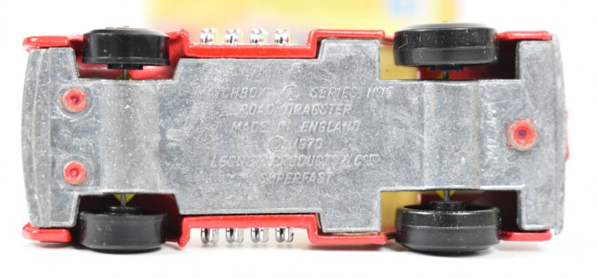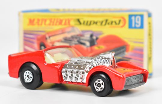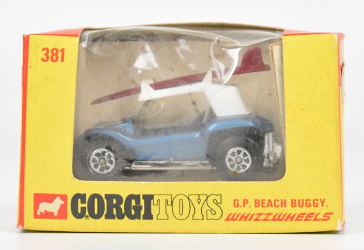 Three Matchbox Superfast and Corgi Whizzwheels diecast model cars comprising Road Dragster 19, Rat Rod Dragster 62 and GP Beach Buggy 381, in original boxes.