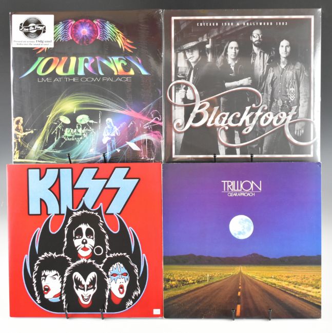 Collection of fifteen Hard Rock / Heavy Metal LPs comprisng. Kiss 'Demos' yellow vinyl limited edition, Blackfoot (sealed in shrink wrap), Journey Live at Cow Place (180g sealed in shrink wrap), Trillion (promo with lyric sheet), Skagarack, Charge, Hustler, Alice Cooper, Airborne (promo with PR flyer), Spys, Stretch, Orange, Saturnalia Magical Love picture disc, Rampage and Munich. Vinyl appears to be VG+ to Ex range in the main