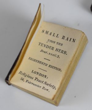 [Antique Miniatures] Pair of Bryce & Son miniature books The Worlds Smallest English & French English Dictionaries, the latter by F.E.A. Gasc, both bound in gilt lettered limp leather and each housed in a hinged metal locket (2.7cm). Two copies of Small Rain Upon the Tender Herb published Religious Tract Society in leather bindings (3.3cm). A History of Flowers with Short Account of Botany printed & sold by Marshall & Co. (7.5cm) in cloth with printed label (5)