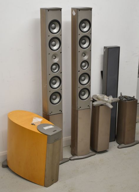Infinity Prelude MTS tower speakers and subwoofer, together with additional stands and Artcoustic soundbar, speaker height 143cm.