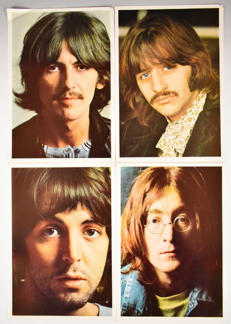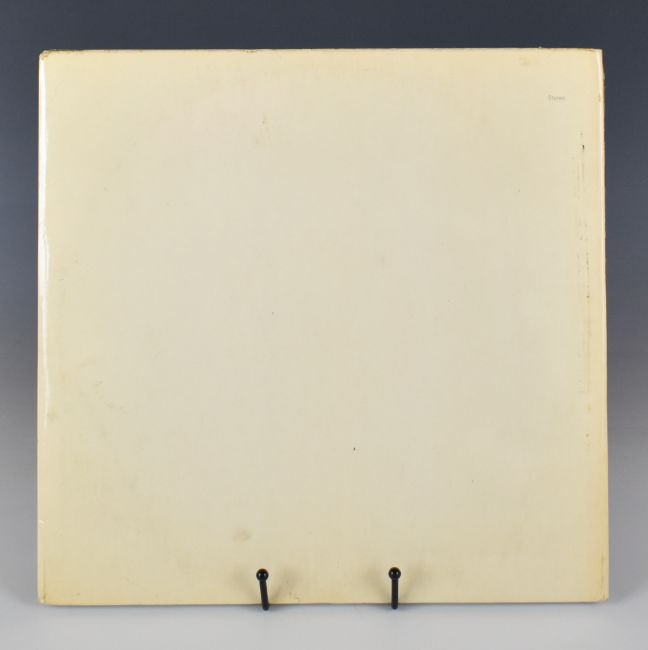 The Beatles White Album (PCS 7068) with top opening cover, four photographs, double sided poster and black inner sleeves. The cover has embossed lettering 'The Beatles' on the front and the word STEREO printed top right on the rear, this copy is numbered 0527080. 'Sold in the UK. subject to resale price conditions, see price list' on the label and “An E.M.I. Recording” text to the left of all four labels. Vinyl appears G / G+ range. The cover is free of splits, tears etc with expected age related wear. The photos, black liners and poster appear to be VG+