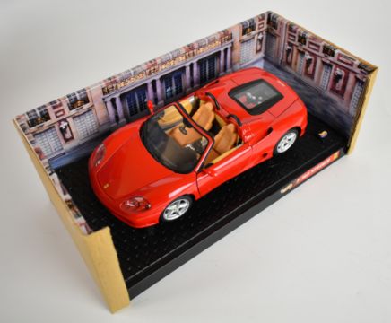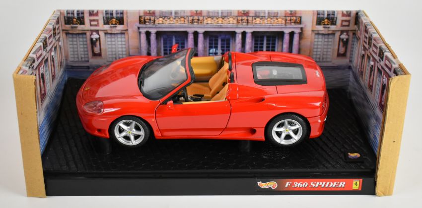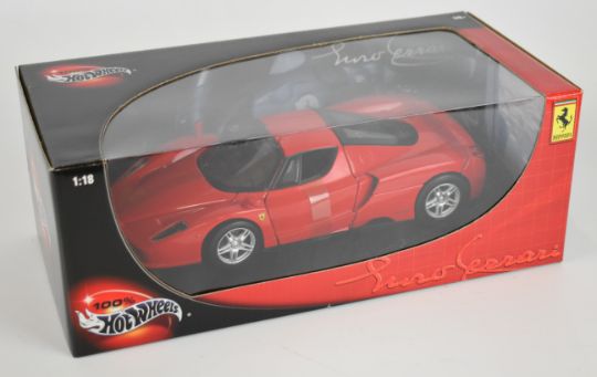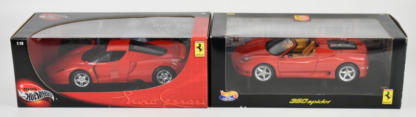 Two Hot Wheels 1:18 scale diecast model Ferrari sports cars comprising Enzo and 360 Spider, both in original display boxes.