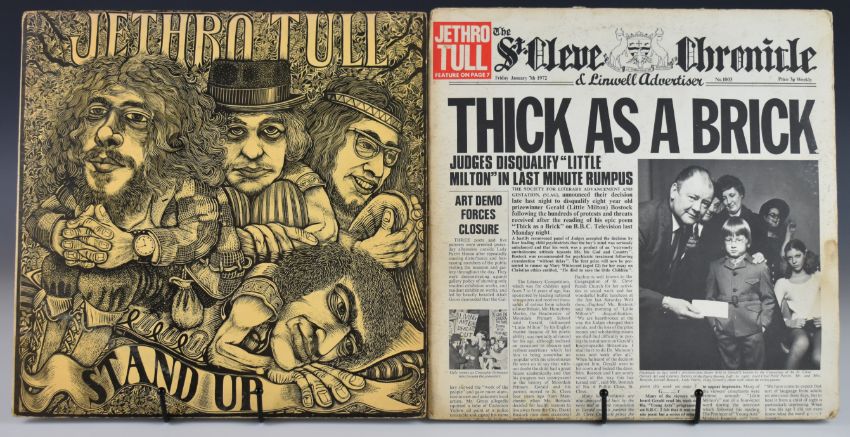 Three Jethro Tull LPs comprising Thick As A Brick, UK first press with 'i' Island logo at top of label, newspaper cover, matrix stamped  A-side CHR 1003 A-3U then PORKY (scratched) and CHR 1003 B-2U then PECKO (scratched); Benefit UK first press with 'i' Island logo at top of label and typo track B2 appears as "A Time For Everything?" on cover, but as "A Time For Everything" on label and Stand Up pink Island 'Bulls Eye' label with Made in England at six o'clock, matt gatefold sleeve with pop up of band when opened. Vinyl appears VG to VG+ in the main
