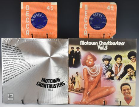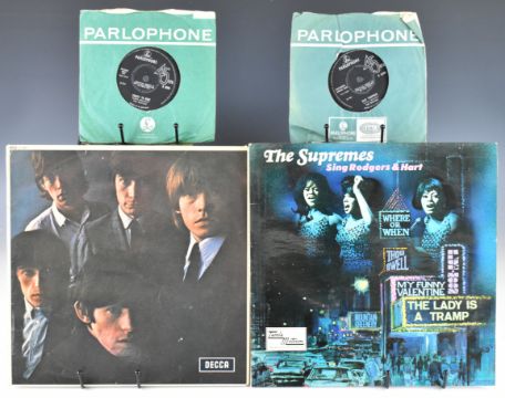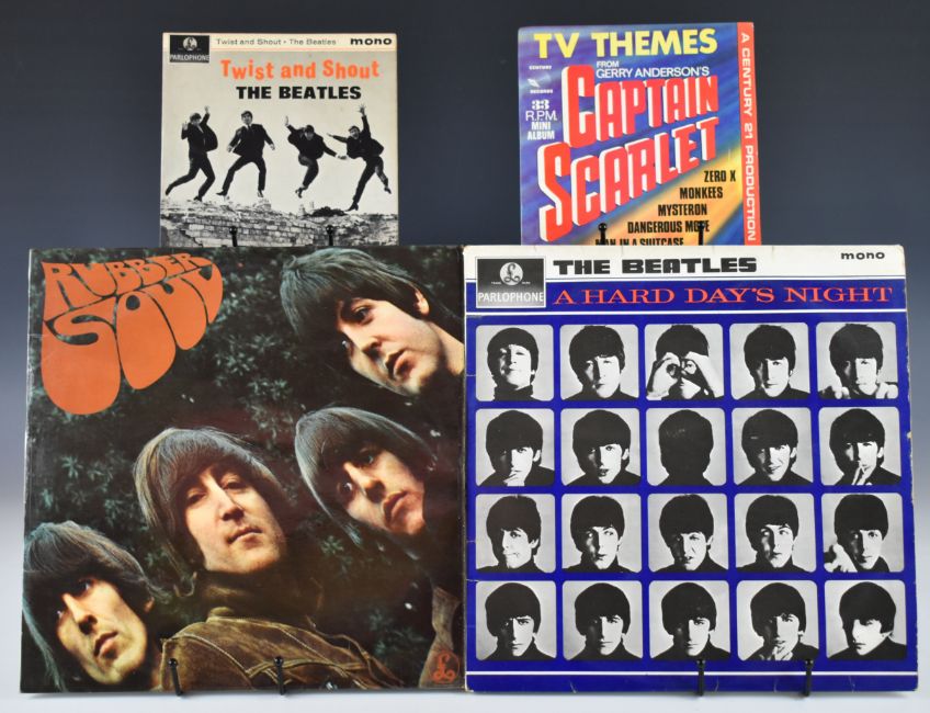 Thirteen mainly 1960s LPs and twenty two 7" singles / EPs. LPs comprise three Rolling Stones including debut self titled album (DECCA LK 4065) and No2 (DECCA LK 4661), both appear to be first / early mono presses, with unboxed red Decca labels with silver writing and the KT stamp in deadwax, both also have 'Made in England' as top centre perimeter text; three Beatles LPs, A Hard Day's Night (PMC 1230), Beatles For Sale and Rubber Soul (PMC 1267), all three are mono and have 'The Parlophone Co..' perimeter text and 'Sold in UK Subject to...', on early black and yellow Parlophone labels with large £ sign and in Emitex inner sleeves; three Tamla Motown, two Simon and Garfunkel, Fleetwood Mac and Art Garfunkel. Singles include Captain Scarlet, three Beatles and five Rolling Stones, and Beatles and Rolling Stones EPs with picture covers. Vinyl appears VG / VG+ in the main.