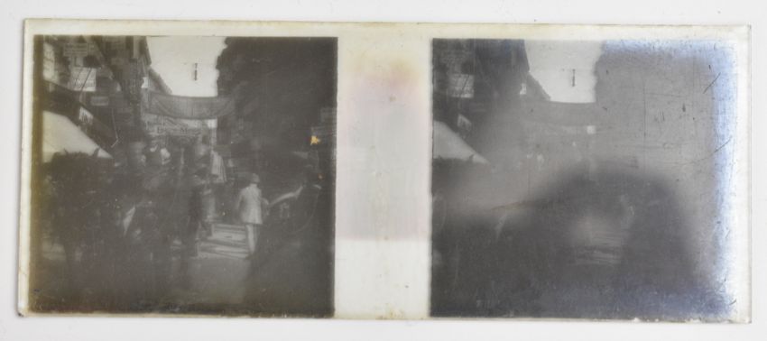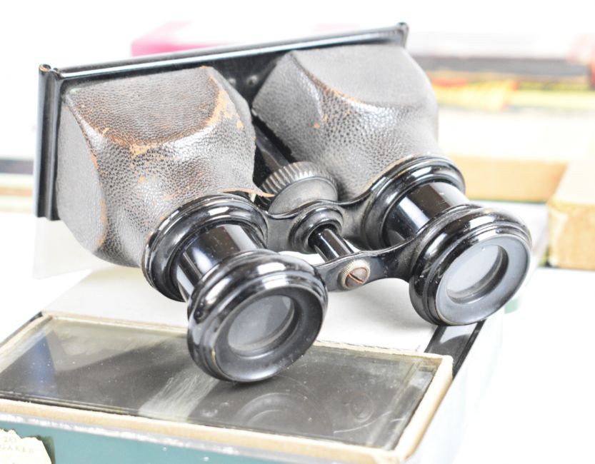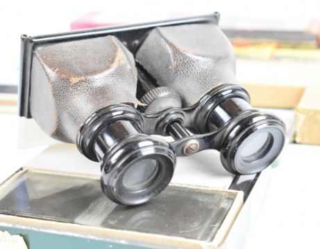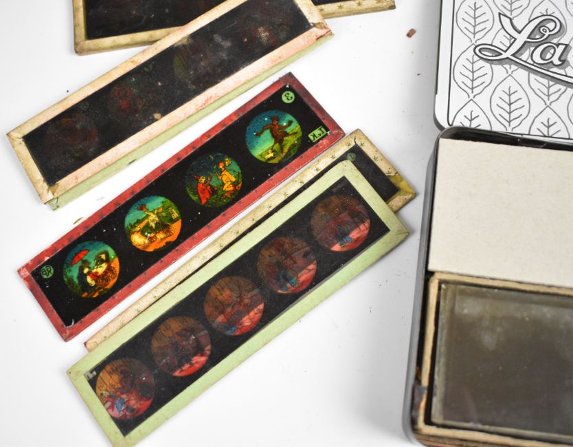 Vintage binocular type stereoscope viewer and Vistascreen together with collection of glass viewing slides (4.5 x 10.5cm) and negatives with images of parades and events, cyclists, zoo or park animals, street scenes and social history, together with magic lantern projector slides with coloured images from Red Riding Hood, a circus, comical musicians, children misbehaving, humanised animals, princesses, Dutch children etc (3.5 x 13cm) and 3D image booklets