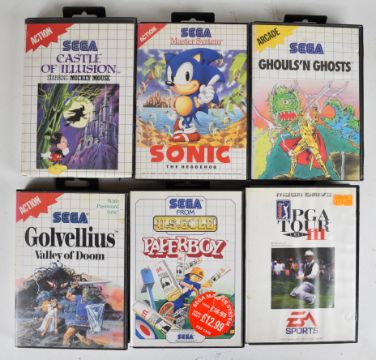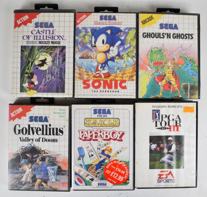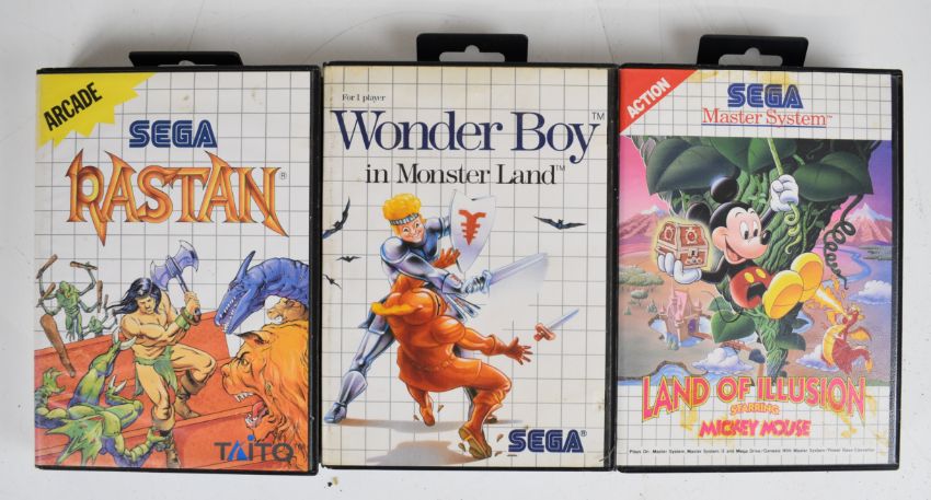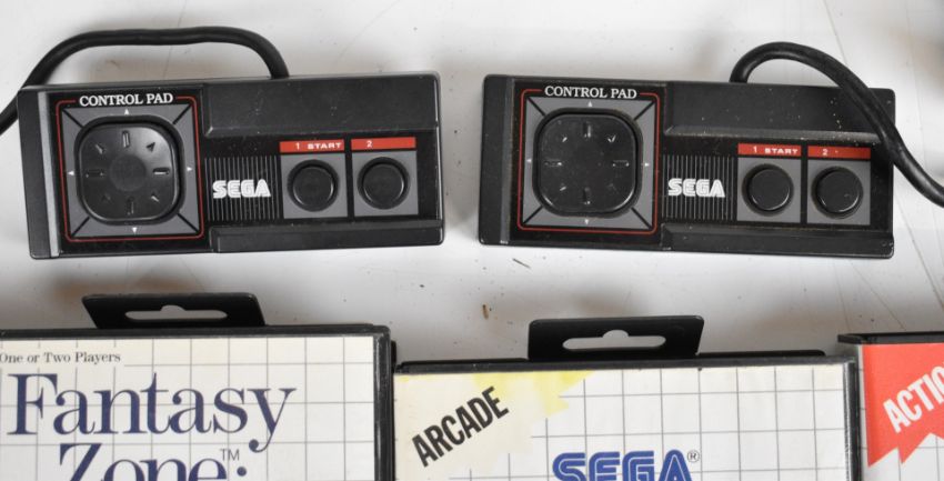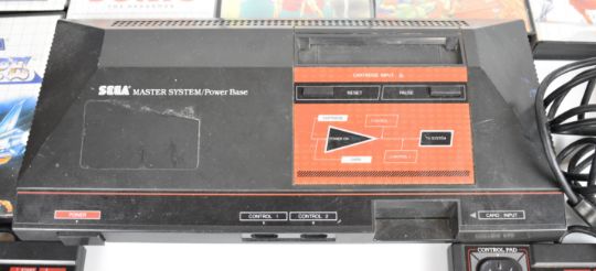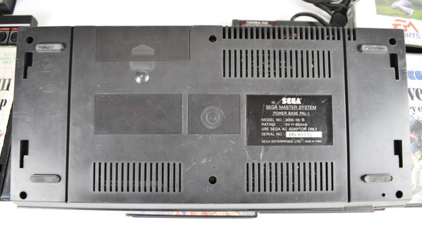 Sega Master System Power Base retro computer games console together with power supply, two controllers and fifteen games comprising R-Type, Golden Axe, Alex Kidd in Shinobi World, Golvellius: Valley of Doom, PGA Tour III, Wonder Boy in Monster Land, Wonder Boy III: The Dragons Trap, Ghouls 'n Ghosts, Rastan, Ghost House, Sonic the Hedgehog, Paperboy, Fantasy Zone: The Maze, Land of Illusion and Castle of Illusion.
