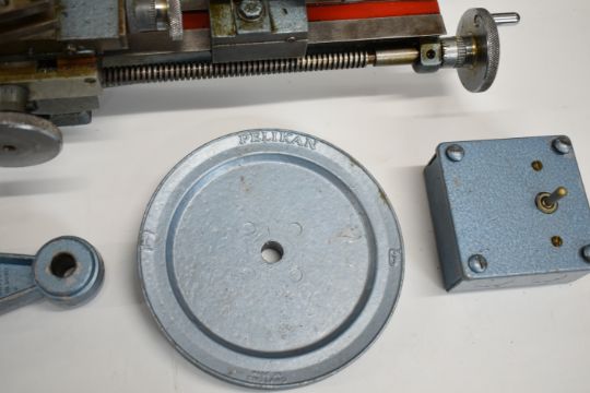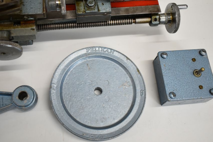 Flexispeed watchmaker's or model engineering lathe, numbered to the hand finished bed 1532, with face plate, three jaw chuck, switch and intermediate pulley, together with matching motor dated 1964, both in original boxes, length of lathe 54cm