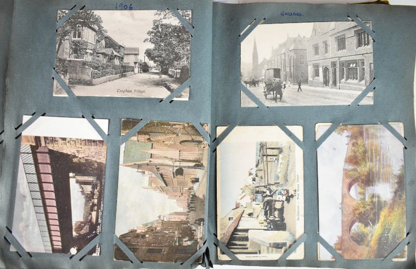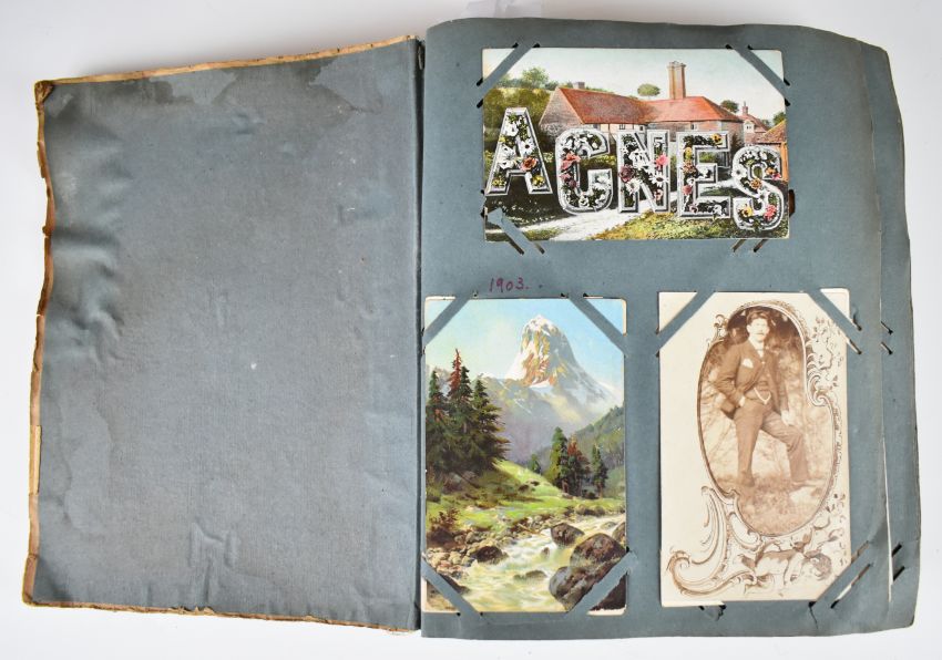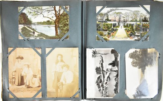 Edwardian postcard album with over two hundred and eighty cards, mostly Scottish including topographical and social history images from Nairn, Glasgow, Leven, Edinburgh and Inverness, Scottish castles and cathedrals, River Tweed, Caledonia canal, Scottish Regiments on parade and exercise, images from Scottish Exhibition 1911, singers coming out at Clydebank, others including greeting and real photo cards of children, Tucks Oilette cards, Airship, Boxing, Fencing and Athletics, Nelson’s Tower, Troopship ‘Rewa’, theatrical portraits and entertainers, Clifton Suspension Bridge, Scilly, Holybourne, Folkestone, Plymouth, Tongham, Tinside Lido etc