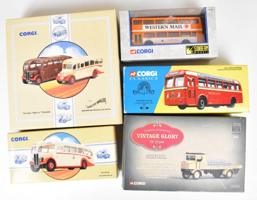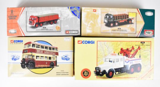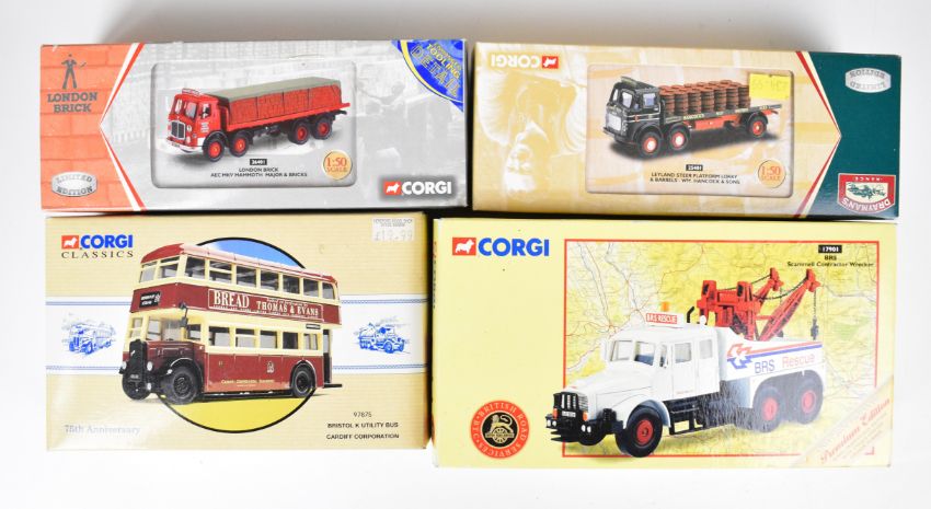 Twenty Corgi diecast model buses and haulage vehicles, all in original boxes.