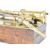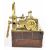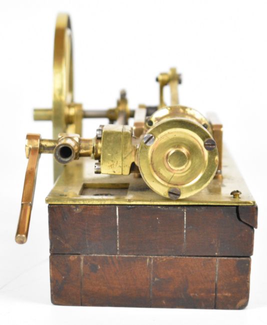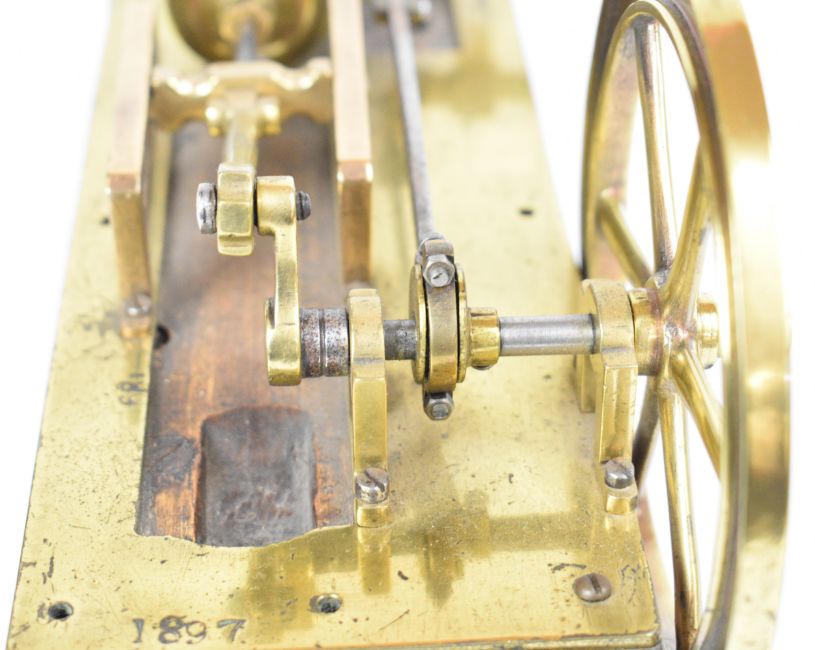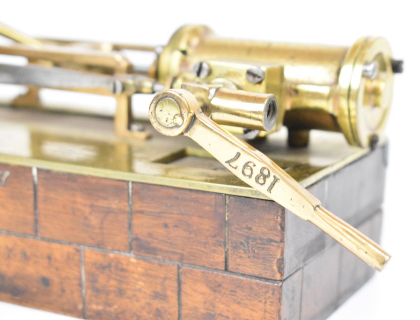 Victorian brass single cylinder horizontal live steam engine with 12.5cm spoked flywheel having throttle valve with date 1897 to lever and also marked as such to the brass bedplate, on faux brick wooden base, overall length 25cm