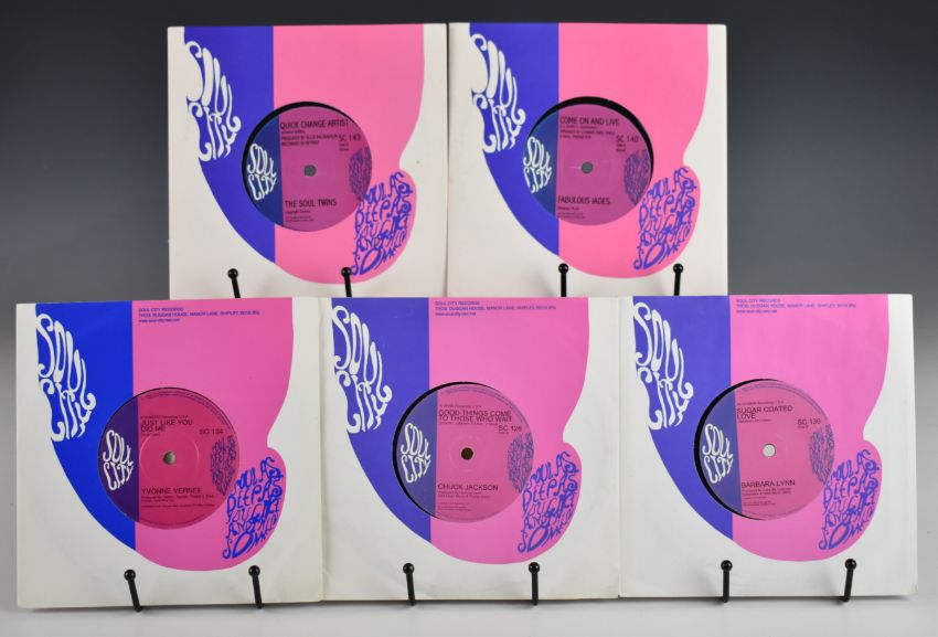Nine Northern Soul 7" singles on the UK Soul City label comprising Chuck Jackson Good Things Come To Those Who Wait / Hand It Over (SC 128), Barbara Lynn Sugar Coated Love / Trying To Love Two (SC 130), Yvonne Vernee Just Like You Did Me / It's Been A Long Time (SC 134), Fabulous Jades Come On And Live / Planning The Moment (SC 140), The Soul Twins Quick Change Artist / Give A Man A Chance (SC 143), Dennis Edwards Johnny On The Spot / I Didn't Have To (SC 147), The Magnificents My Heart Is Calling You / On Main Street (SC 149), J Wyatt This Thing Called Love / To Whom It May Concern (SC 156) and The Appreciations I Can't Hide It / No No No (SC 157). Vinyl appears Ex to NM in the main and all are in Soul City company sleeves.