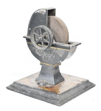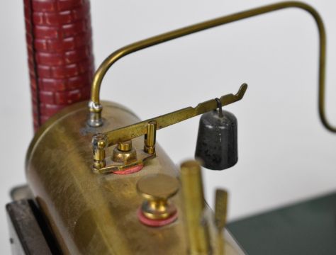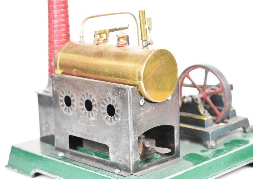 Bing stationary live steam engine with faux brick chimney, lever operated whistle to boiler, weighted safety valve and single cylinder slip eccentric engine with spoked flywheel, overall width of base 22.5cm, together with a miniature grindstone and similar press or punch