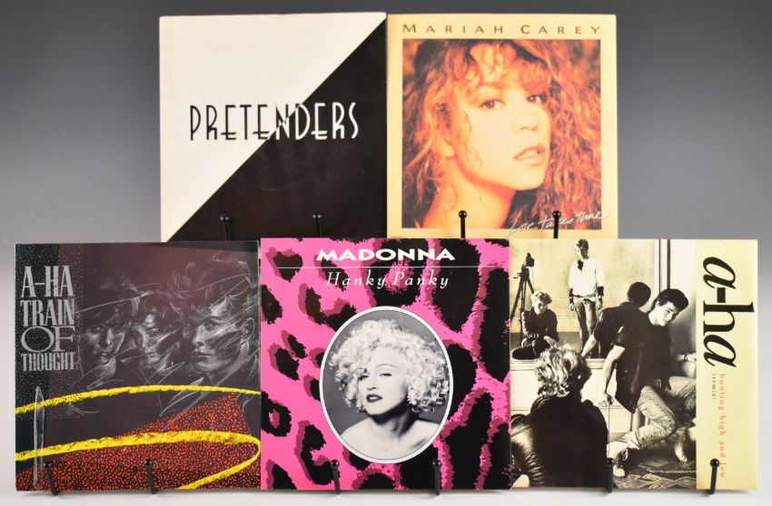 Approximately eighty Post Punk / Pop / Heavy Rock etc 7" singles including two Prince and the Revolution, FM, Dio, Cinderella, Gary Moore, Vanilla Ice, Police, OMD, Modern Talking, two Nick Kamen, INXS, Curiosity Killed The Cat, Ultravox, Duran Duran, five Madonna, A-ha, The Pretenders, Mariah Carey, Deon Estus, Elton John, Boom Boom Room, Janet Jackson, Cashflow, Sammy Hagar, Falco, Status Quo etc. Most have picture covers, vinyl appears to be VG+ to Ex in the main.