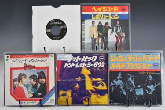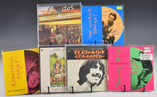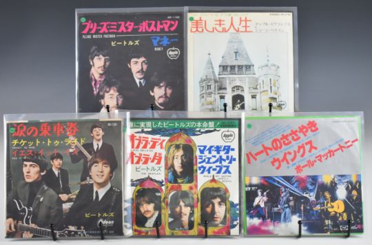 Thirty six mostly foreign Beatles 7" singles. Muchachos (Boys) / Kansas City Peruvian Odeon picture cover, Good Day Sunshine (45-DPE-190) Indian release, Like Dreamers Do / Searchin (Deccagone) red vinyl bootleg, Hello Goodbye (R 5665) Singapore, four UK releases including Fan Club Beatles' Christmas Record flexi-disc (LYN 757), Magical Mystery Tour double 7" gatefold with booklet and All You Need Is Love picture disc, three Brazilian releases on Odeon, three French picture cover singles, eleven Japanese picture cover singles, two USA Swan copies of She Loves You (bootlegs?), two USA Capitol 'For Jukebox Only' singles, three Japanese John Lennon / Yoko Ono picture cover singles, three UK and one Japanese Wings / Paul McCartney picture cover singles and one Japanese George Harrison picture cover single. Vinyl and covers appear VG+ to Ex in the main
