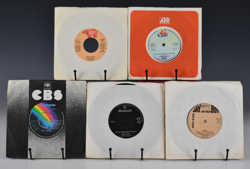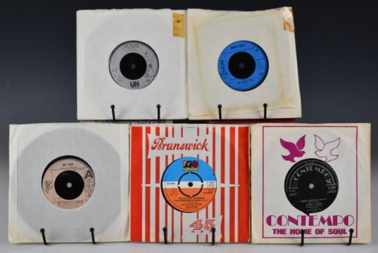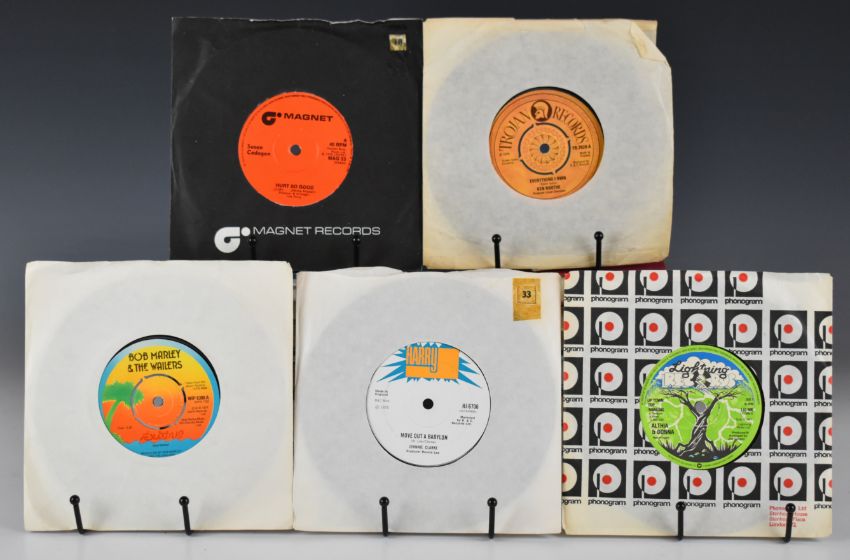 Seventy two Reggae / Soul / Funk / Dance 7" singles including Johnny Clarke, Bob Marley, Ken Booth, Susan Cadogan, Emperor Rosko, Judge Dread, Zap Pow, James Brown, Isaac Hayes, Harold Melvin, Impressions, Isley Brothers, Candi Staton, Main Ingredient, Hues Corporation, Stylistics, Love Unlimited, AWB, Hamilton Bohannon, Van McCoy, Rimshots, Moments, Betty Wright, Chi-Lites, Tavares, Chic, Wild Cherry, Diana Ross, George McCrae, Juggy Jones, Rose Royce, Barry White, Fatback Band, Syreeta, Osibisa, Ish, JALN Band etc. Vinyl appears to be clean and VG+ or better in the main.