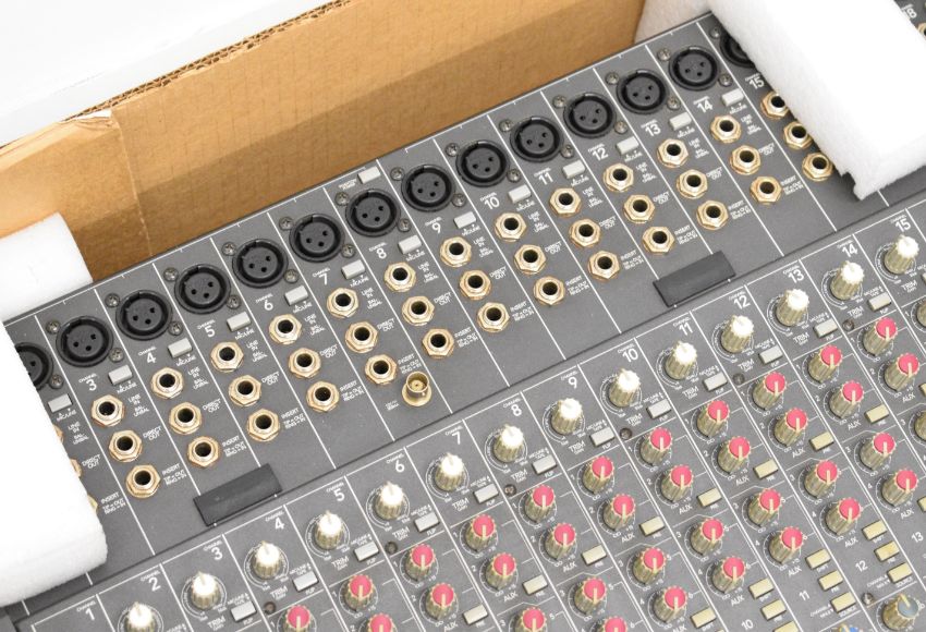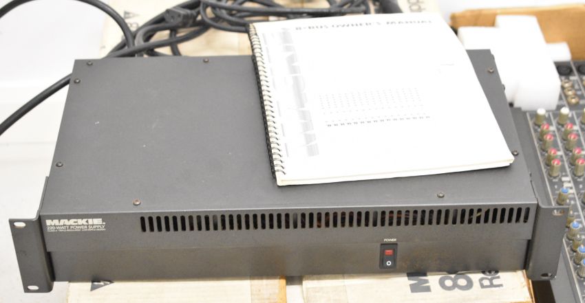 Home studio recording equipment comprising Mackie 8-Bus 24 channel mixing desk, external power supply and meter bridge, all in original boxes.