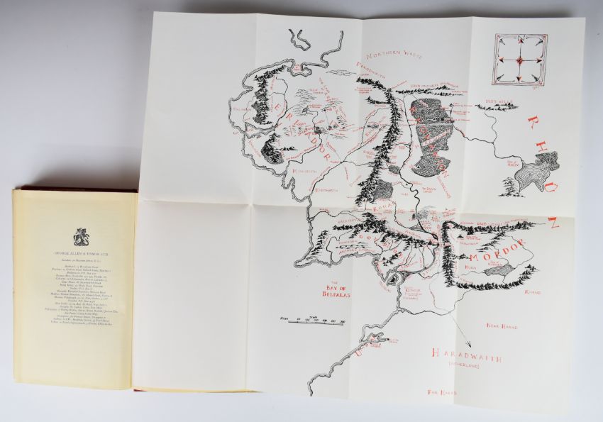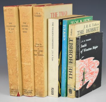 [First Edition] J.R.R. Tolkien Lord Of the Rings trilogy published George Allen & Unwin 1965-1966 comprising The Fellowship of the Ring 1966 fifteenth impression; The Two Towers 1966 twelfth impression; The Return of The King 1965 eleventh impression, each volume with folding map at rear, bound in publisher's gilt lettered cloth and all three volumes in original unclipped printed dustwrappers, together with Tolkien’s Smith of Wootton Major illustrated by Pauline Baynes 1967, The Hobbit 1966, The Tolkien Companion 1978 and another (7)