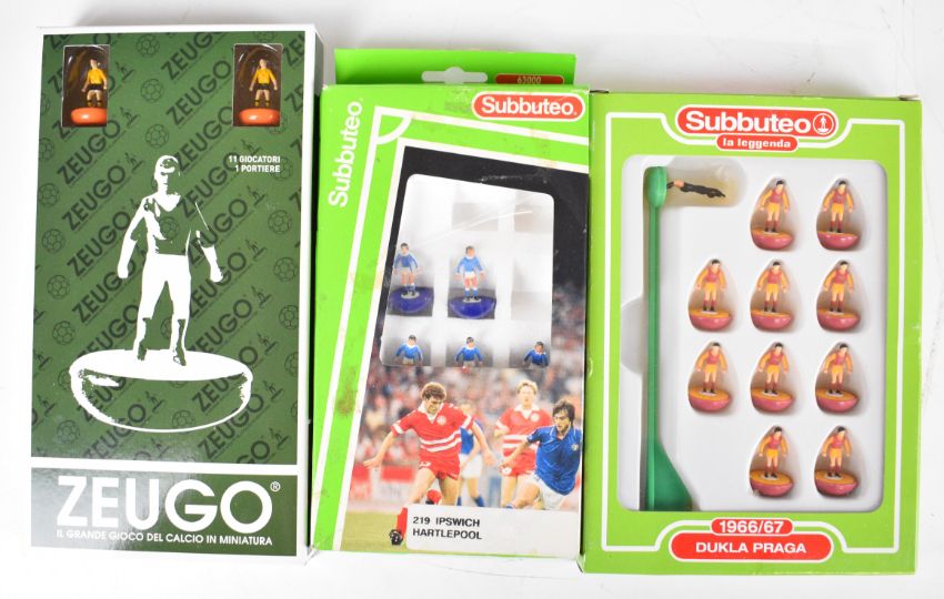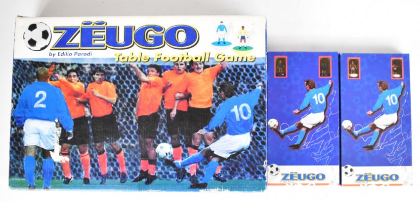 Zuego and Subbuteo table football items comprising main game, additional teams, goals and scoreboards, all boxed.