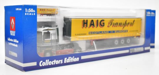 Two Universal Hobbies 1:50 scale diecast model haulage vehicles comprising Iveco Stralis 'DHL' and Renault 'Haig Transport' both boxed with keyrings.
